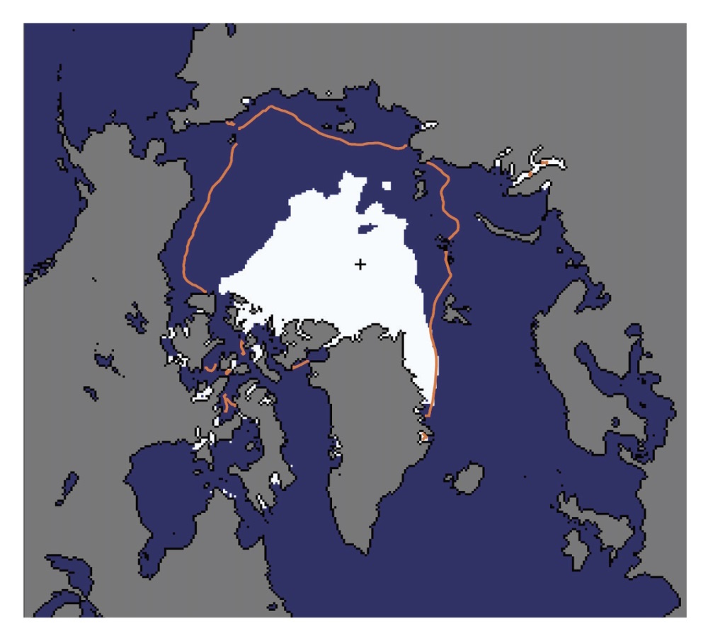 Figure 5. The Arctic summer sea ice extent in 2012, (measured in September) was a record low, shown (in white) compared to the median summer sea ice extent for 1979 to 2000 (in orange outline). In 2013, Arctic summer sea ice extent rebounded somewhat, but was still the sixth smallest extent on record. Source: National Snow and Ice Data Center