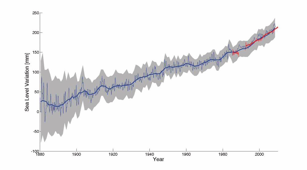 Figure 6. Observations show that the global average sea level has risen by about 16 cm (6 inches) since the late 19th century. Sea level is rising faster in recent decades; measurements from tide gauges (blue) and satellites (red) indicate that the best estimate for the average sea level rise over the last decade is centred on 3.6 mm per year (0.14 inches per year). The shaded area represents the sea level uncertainty, which has decreased as the number of gauge sites used in calculating the global averages and the number of data points have increased. Source: Shum and Kuo (2011)