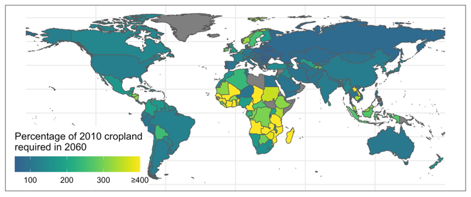 Figure 2: Cropland demand in 2060 if national food demand and national yields follow past patterns and trajectories. Note the projected preponderance of land clearing in the tropics. Many African countries could need to triple or quadruple their 2010 cropland areas by 2060 (300% or 400% of current). Based on analyses in Tilman et al. 2017.